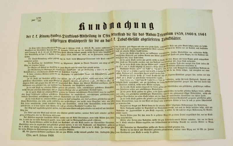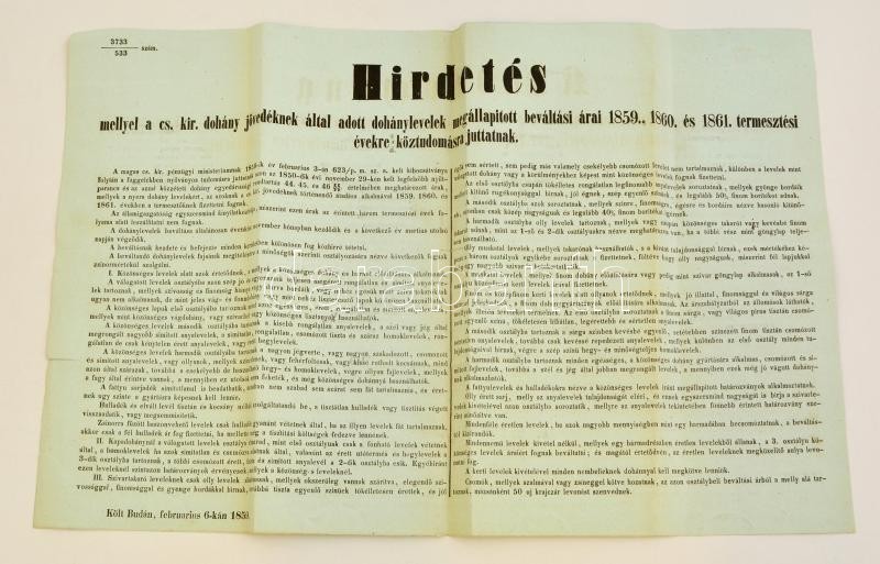 Beschreibung: 1859 Buda, Hirdetés dohánylevelek beváltási áráról az 1859-1961. termesztési évekre