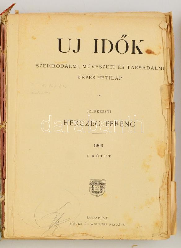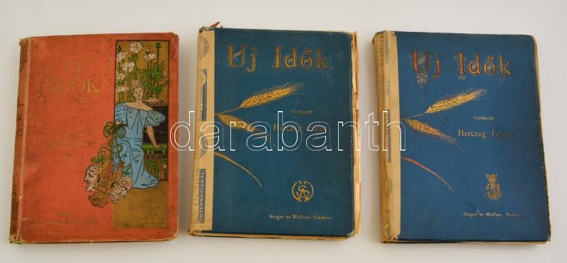 1899-1906 Új Idők folyóirat, 1899 V. évf. I. kötet, VII. évf. 1901. II. kötet, XII. évf. 1906 I. kötet, 3 fél évfolyam. Szerk.: Herczeg Ferenc. Bp., Singer és Wolfner. Kiadói aranyozott egészvászon-kötés, illetve kiadói aranyozott, illusztrált egészvászon-kötés, megviselt állapotban, kopott borítóval, kettő gerince javított, számos kijáró lappal, az 1901-es kötetben pár lap hibásan, rossz helyen van bekötve.