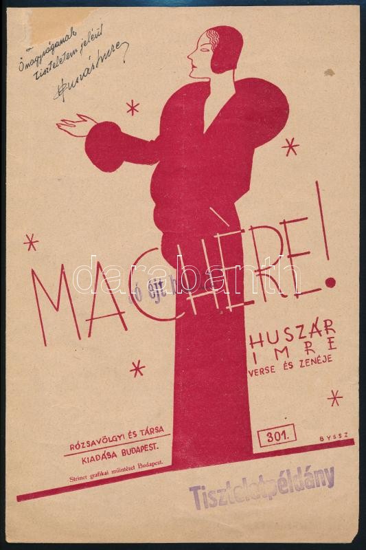 Beschreibung: 1931 Huszár Imre "Ma chere!" c. szerzeményének kottája, Bp., Rózsavölgyi és Társa, Byssz Róbert tervezte címlappal, a címlapon Huszár dedikációjával