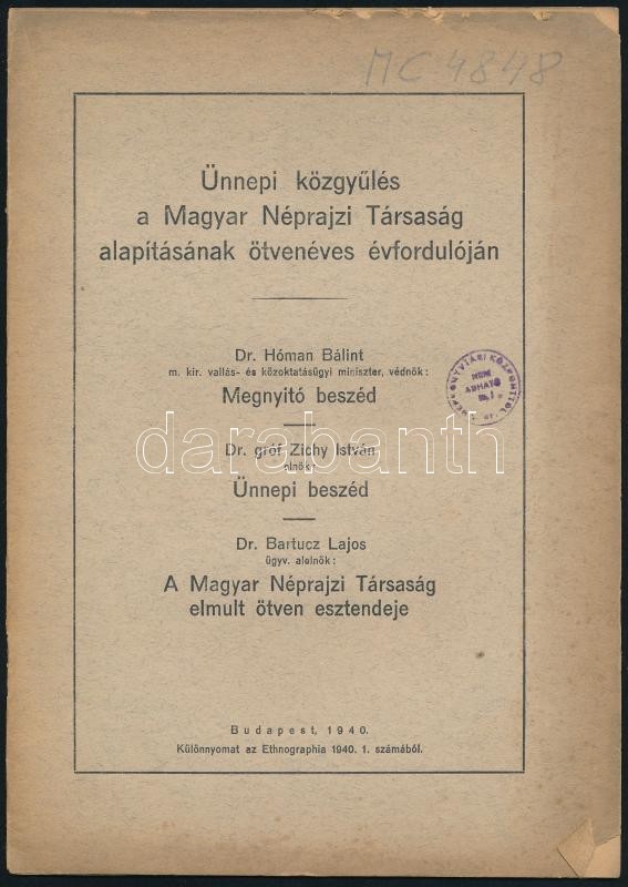 1940 Ünnepi közgyűlés a Magyar Néprajzi Társaság alapításának ötvenéves évfordulóján. Dr. Hóman Bálint megnyitó-, Dr. gróf Zichy István ünnepi beszédével, és Dr. Bartucz Lajos előadásával. Különlenyomat az Ethnographia 1940. 1. sz. Bp.,1940, (Kertész József-ny., Karcag), 16 p.