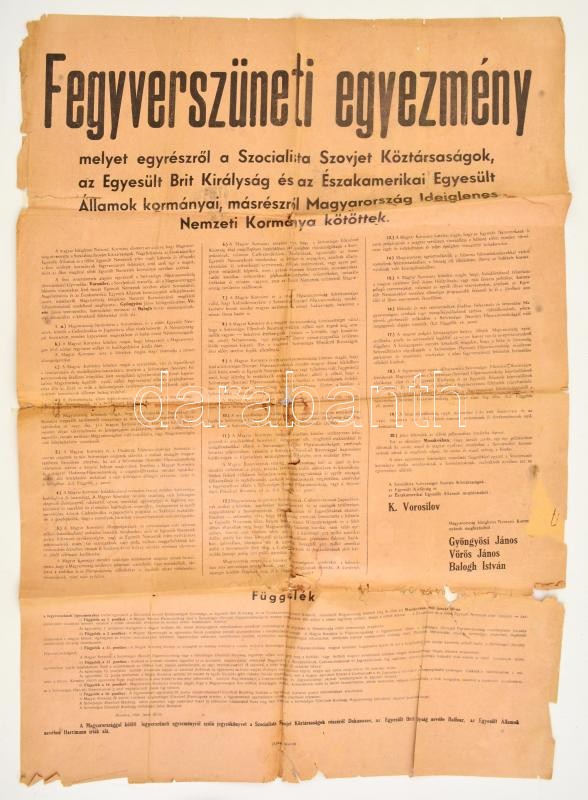 1945 Fegyverszüneti egyezmény, melyet a Szocialista Szovjet Köztársaságok [...] Magyarország Ideiglenes Nemzeti Kormánya kötöttek, nagyméretű hirdetmény, megviselt állapotban, ragasztásokkal, szakadásokkal, 75x55 cm
