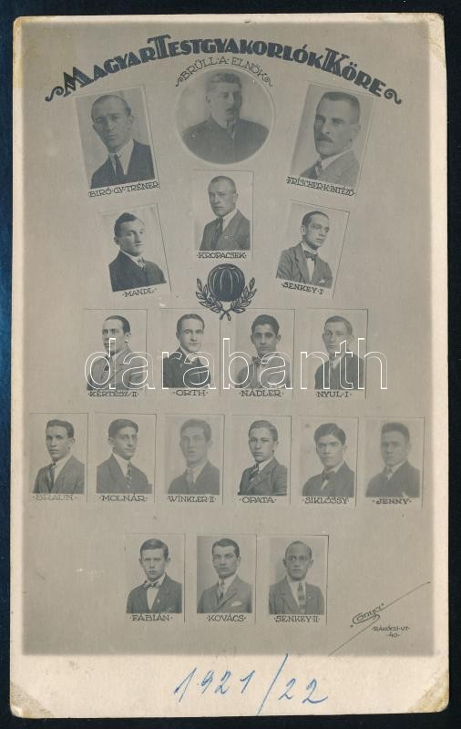 1922 Az MTK tablóképe nevesített portrékkal (Mandl, Kropacsek, Senkey, Kertész II., Orth, Nádler, stb.), fotó, sarkain ragasztásnyomokkal, 13,5x8,5 cm