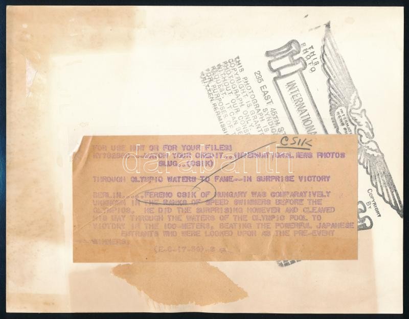 Beschreibung: 1936 Csik Ferenc (1913-1945) olimpiai bajnok fotója a berlini olimpiáról, hátoldalán feliratozva17x21,5 cm