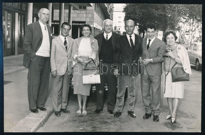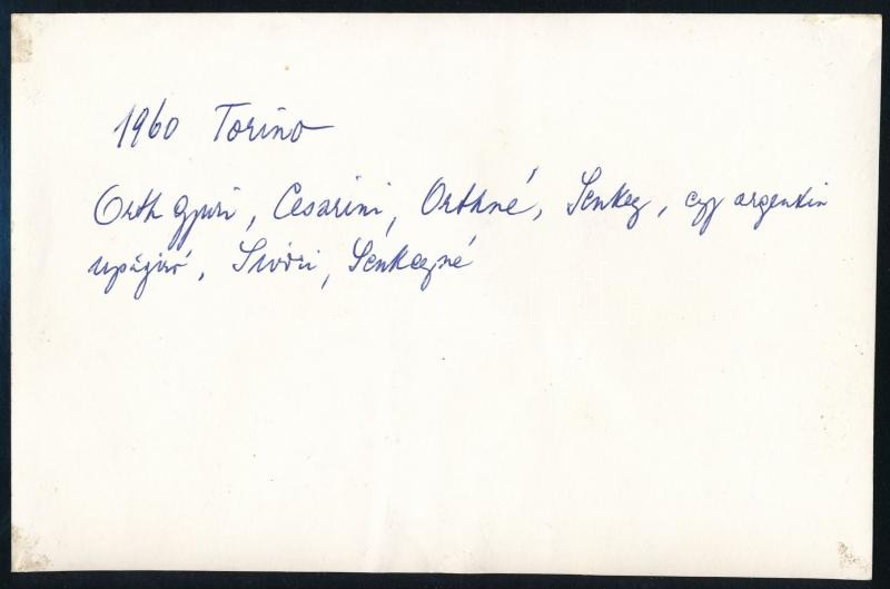 1960 Torino, Csoportképen Orth György, Orthné, Renato Cesarini, Senkey Imre, Senkeyné, Dante Panzeri, Omar Sivori, hátoldalon feliratozott fotó, 12x18 cm