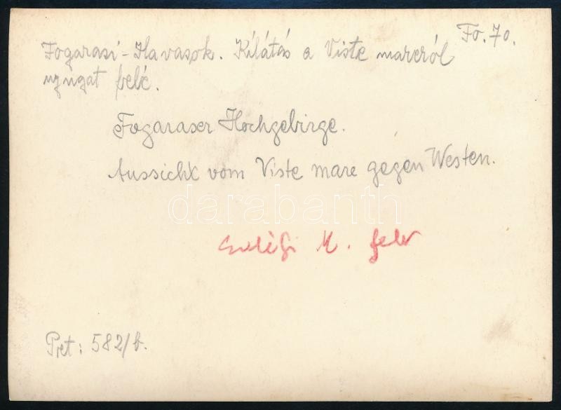 cca 1910 Fogarasi-havasok, kilátás a Nagy-Vistről nyugat felé, Erdélyi Mór felvétele, hátulján feliratozva, pecséttel jelzett, 11,5×16 cm / cca 1910 Munţii Făgăraş, the westward view from Viştea Mare, vintage photo, with notes on its back, 11,5×16 cm