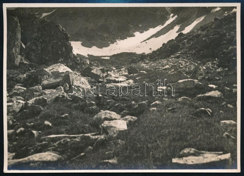 cca 1910 Retyezát, zergék a Pelaga alatt a hómezőn, Erdélyi Mór felvétele, hátulján feliratozva, pecséttel jelzett, 11,5×16 cm / cca 1910 Munţii Retezat, chamois on the snowfield under the Peleaga, vintage photo, with notes on its back, 11,5×16 cm