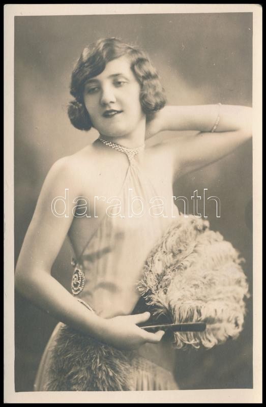 cca 1920-1930 Hölgy legyezővel, fotólap, 14x9 cm https://www.darabanth.com/de/316-Fernauktion/316.0/Andere-Sammelgebiete/Foto~19/cca-1920-1930-Holgy-legyezovel-fotolap-14x9-cm~II1735415