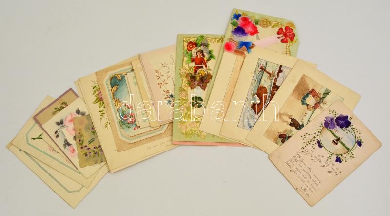 Beschreibung: cca 1900-1930 Régi kézzel rajzolt levelezőlapok, litho matricákkal díszített levélpapírok, 25 db
