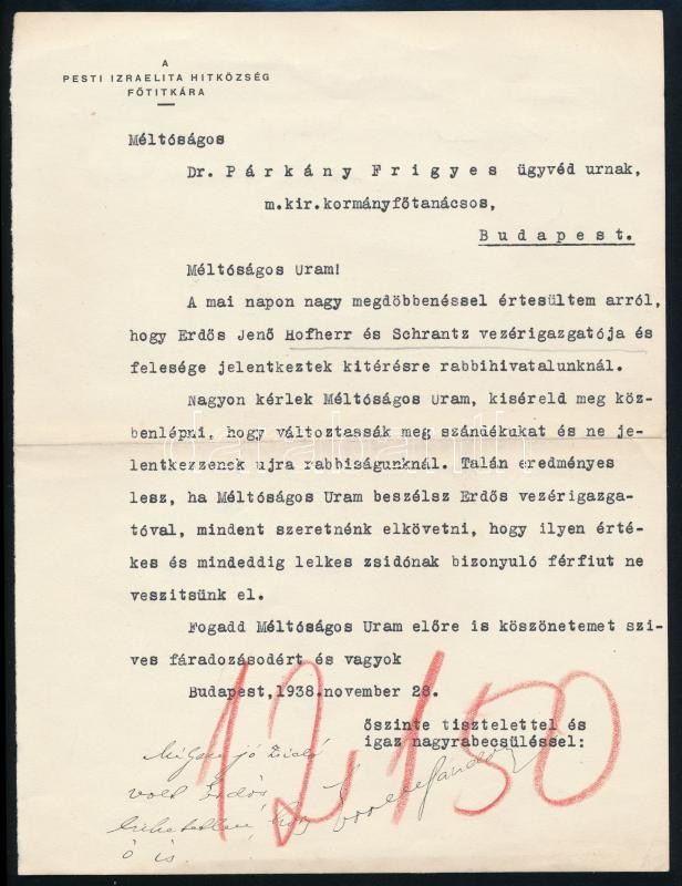 1938 Bp., A Pesti Izraelita Hitközség Főtitkára által írt levél, zsidó... https://www.darabanth.com/de/316-Fernauktion/316.0/Andere-Sammelgebiete/Judaica~24/1938-Bp-A-Pesti-Izraelita-Hitkozseg-Fotitkara-altal-irt-level-zsido-hitbol-valo-kiterC3~II1736020