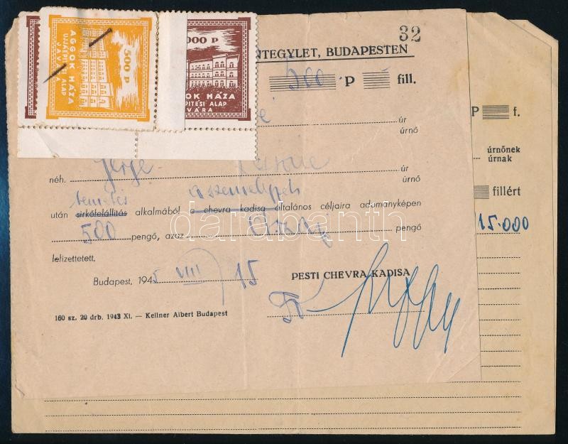 Beschreibung: 1945 Bp., Pesti Chevra Kadisa Izraelita Szentegylet újjáépítése alapja számára kiállított nyugták és illetékbélyegek