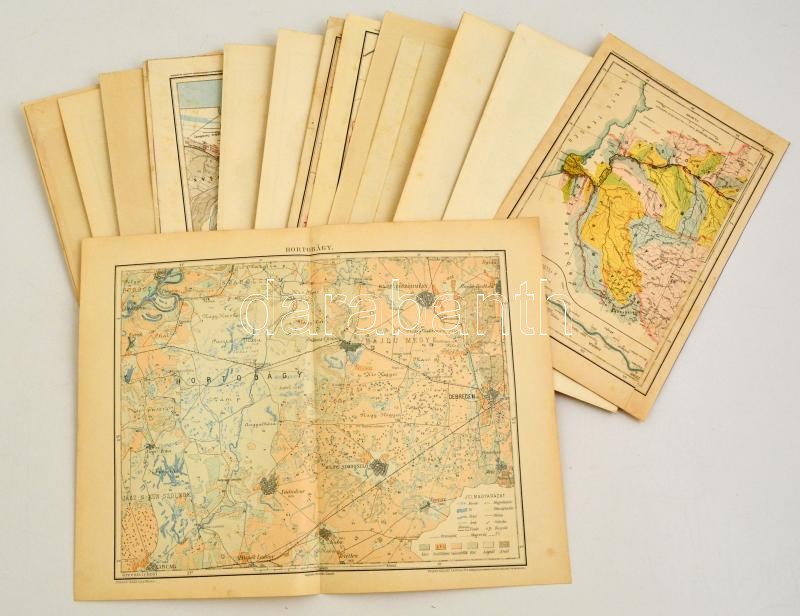 17 db térkép a Pallas Nagy Lexikonából, köztük: A Duna, Európa Árpád halálakor, Európa Mátyás király halála évében, Pest 1758-ban, Fiume és kikötője, Kárpátok, Hortobágy, A cigányok elterjedése Európában. Posner Károly Lajos és Fia térképészeti műintézete. Különböző méretben.