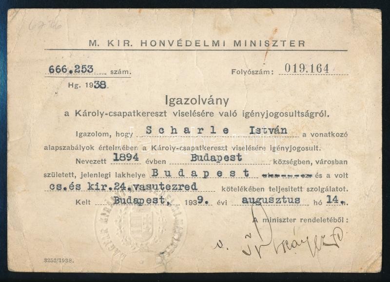 1939 Bp., M. Kir. Honvédelmi Miniszter által kiadott igazolvány Károly-csapatkereszt viselésére való igényjogosultságról, Sárkány Jenő ezredes aláírásával