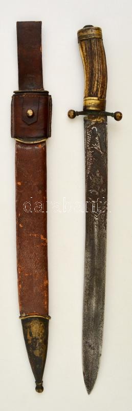 Vaddisznóölő tőr, kovácsolt, vadászmotívumos pengével, agancs nyéllel,... https://www.darabanth.com/de/316-Fernauktion/316.0/Andere-Sammelgebiete/Militaria~25/Vaddisznoolo-tor-kovacsolt-vadaszmotivumos-pengevel-agancs-nyellel-tokkal-pengehossz-~II1732362