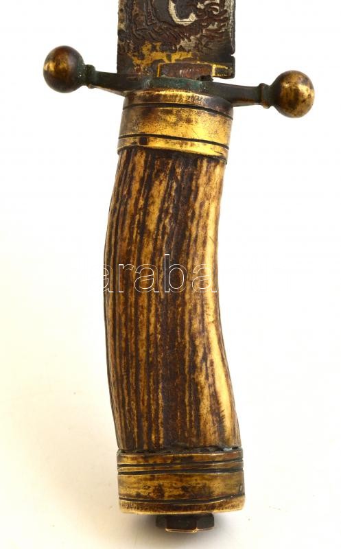 Beschreibung: Vaddisznóölő tőr, kovácsolt, vadászmotívumos pengével, agancs nyéllel, tokkal, pengehossz: 38,5 cm, teljes hossz: 51 cm