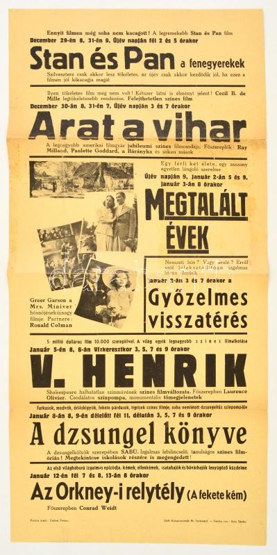 Beschreibung: 1942 Stan és Pan, Arat a vihar, Megtalált évek és egyéb filmek műsoros moziplakátja, hajtott, szakadással, 58x28 cm