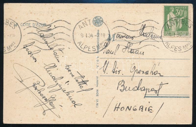 Beschreibung: 1934 Berkessy Elemér (1905-1993) labdarúgó üdvözlő sorai és aláírása Antibes-ről Haán Pál állami színházi tisztviselő részére küldött levelezőlapon