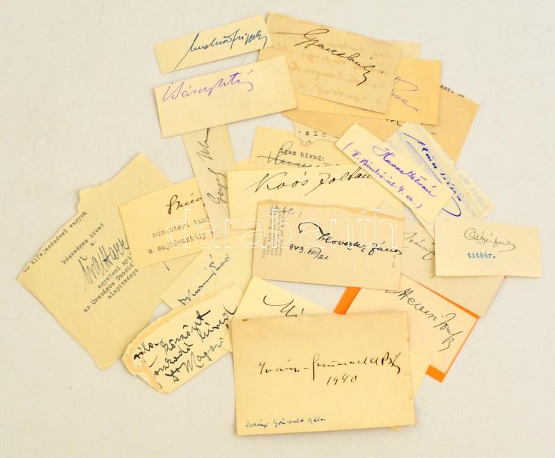 Vegyes aláÃrás tétel, 22 db, közte Iványi-Grünwald Béla (1867-1940) magyar festÅ‘, Havas István, Szécsi Ferenc, Márkus JenÅ‘, Molnár Frigyes és mások aláÃrásaival, papÃrlapokon, kivágásokon.