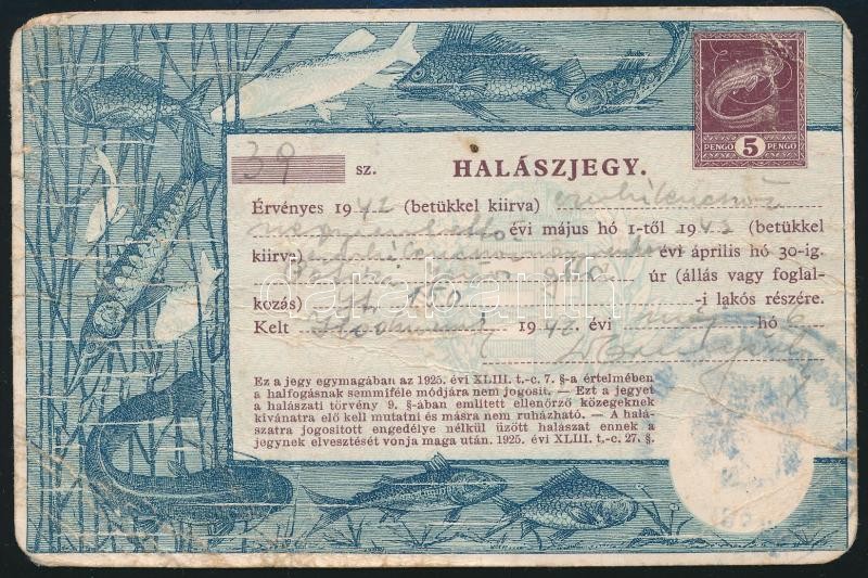 1942 Halászjegy 5P benyomott illetékkel (gyűrött) https://www.darabanth.com/de/316-Fernauktion/316.0/Andere-Sammelgebiete/Stempelmarken~15/1942-Halaszjegy-5P-benyomott-illetekkel-gyurott~II1740102