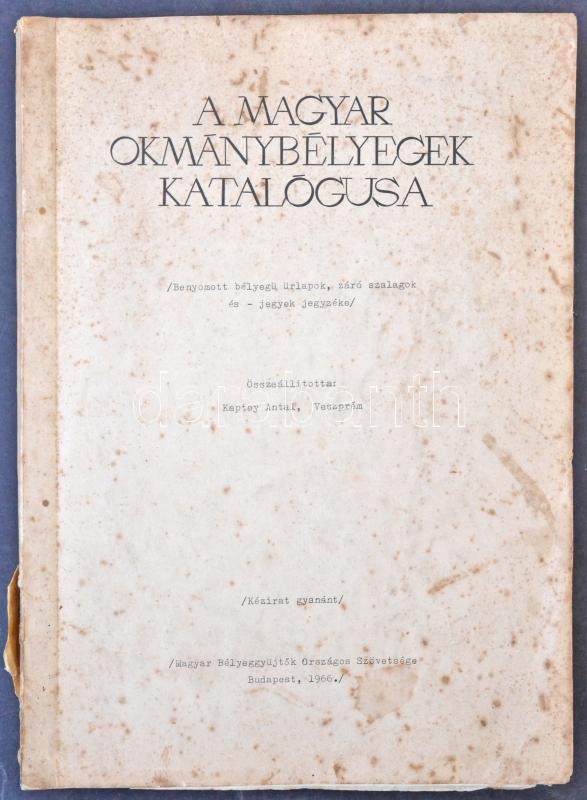 Kaptay Antal: A magyar okmánybélyegek katalógusa (1966) (foltos) https://www.darabanth.com/de/316-Fernauktion/316.0/Andere-Sammelgebiete/Stempelmarken~15/Kaptay-Antal-A-magyar-okmanybelyegek-katalogusa-1966-foltos~II1722618