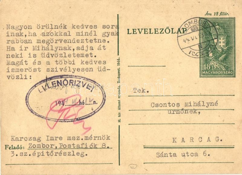 1944 Karczag Imre zsidó KMSZ (közérdekű munkaszolgálatos) mérnök levele a zombori munkatáborból / WWII Letter of a Jewish labor serviceman engineer from the labor camp of Sombor. Judaica + 18f Ga. (EK)