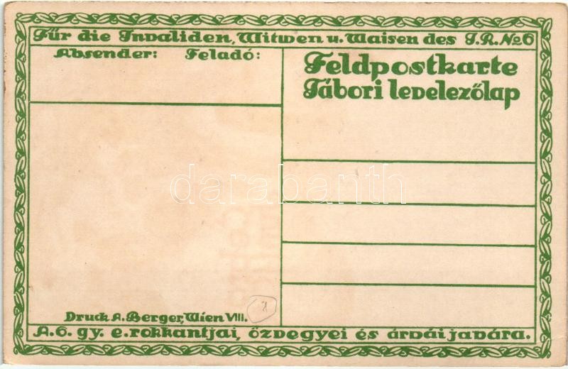 Beschreibung: 1916 Cebrow, Juni / 6. gyalogezred rokkantjai, özvegyei és árvái javára / WWI K.u.K. military charity art postcard. A. Berger litho. s: Klaus