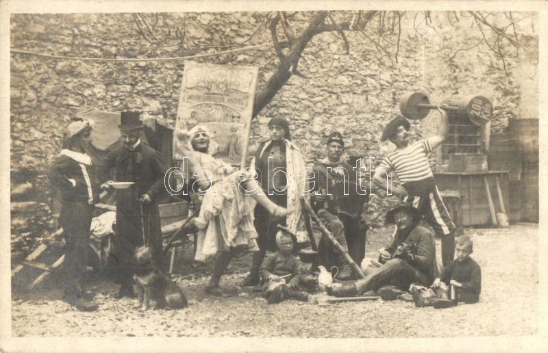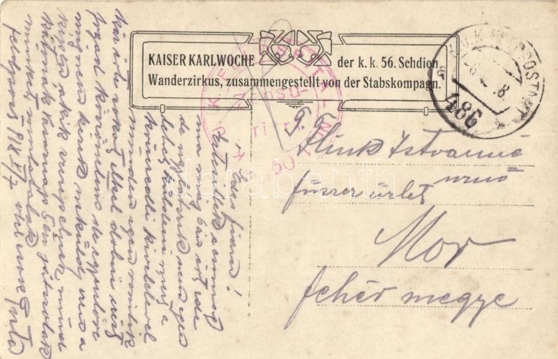 1918 Kaiser Karl Woche der k. k. 56. Schdion. Wanderzirkus zusammengestellt von der Stabskompagnie / Osztrák-magyar katonákból összeállt vándorcirkusz a táborban / WWI Austro-Hungarian K.u.K. military traveling circus assembled of soldiers. photo + K.u.K. Feldspital Nr. 109. Zensuriert