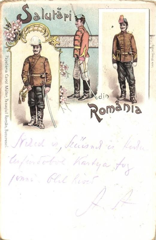 1899 Salutari din Romania! Carol Müller / Üdvözlet Romániából! Román katonai egyenruha / Greetings from Romania! Romanian military uniforms, soldiers. Louis Glaser floral Art Nouveau litho (EK)