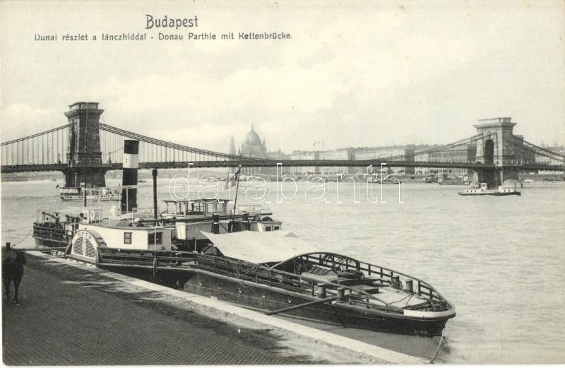 Beschreibung: Böős oldalkerekes vontató gőzhajó Budapesten a Lánchídnál / Hungarian towing steamship in Budapest