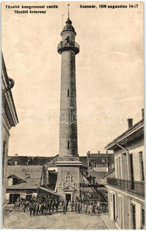 1908 Szatmárnémeti, Satu Mare; Tűzoltó Kongresszusi emlék, tűzoltó őrtorony / Memorial postcard from the Fire Fighting Congress, firefighter watch tower