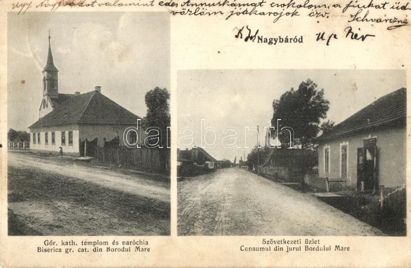 Nagybáród, Borod; Görögkatolikus templom és parókia, Szövetkezeti üzlet / Biserica gr. cat. din Borodul Mare, Consumul din jurul Bordului Mare / Greek Catholic church and parsonage, cooperative shop (EK)