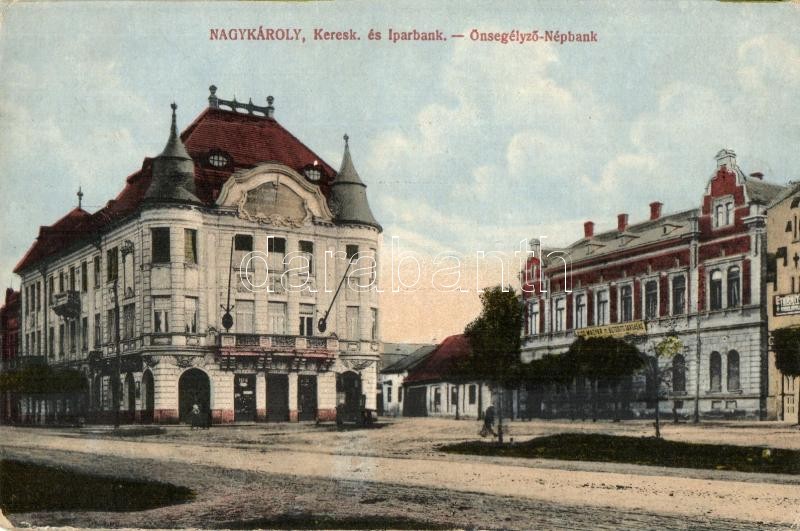 Nagykároly, Carei; Kereskedelmi és Iparbank, Önsegélyző Népbank, Első Magyar Biztosító Társaság fiókja. Eigner Simon kiadása / bank, insurance company, shops (kopott szélek / worn edges)