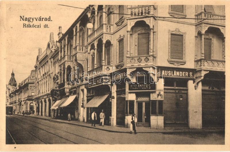 Nagyvárad, Oradea; Rákóczi út, Ausländer S., Cziller Imre üzletei, vil... https://www.darabanth.com/de/316-Fernauktion/316.0/Ansichtskarten/Siebenburgen~1500006/Nagyvarad-Oradea-Rakoczi-ut-Auslander-S-Cziller-Imre-uzletei-villamos-Benko-Arthur-kia~II1734519