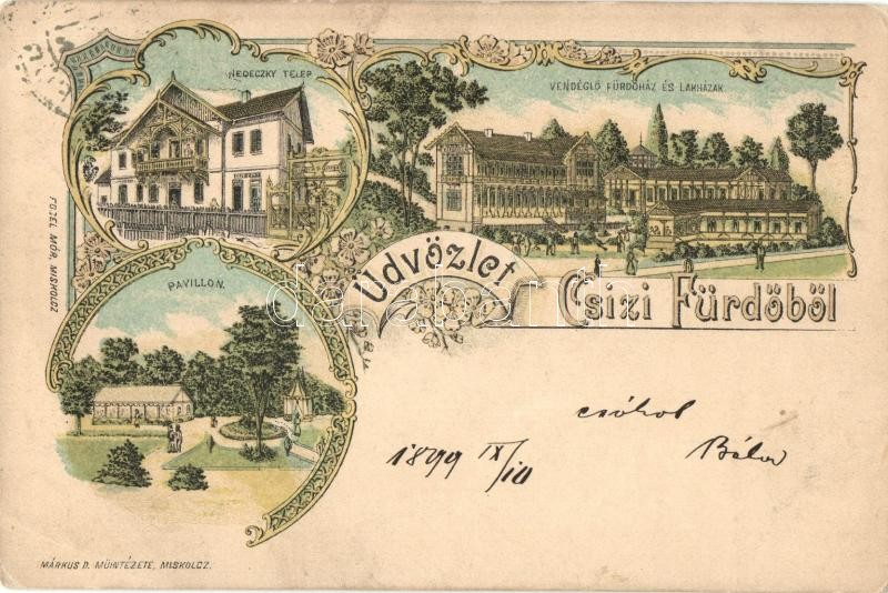 1899 Csízfürdő, Kúpele Ciz; Nedeczky-telep, villa, Vendéglő, Fürdőház, lakházak, pavilon. Fogel Mór, Márkus D. Műintézete / villa, restaurant, spa hall, hotel, pavilion. floral Art Nouveau litho (EK)