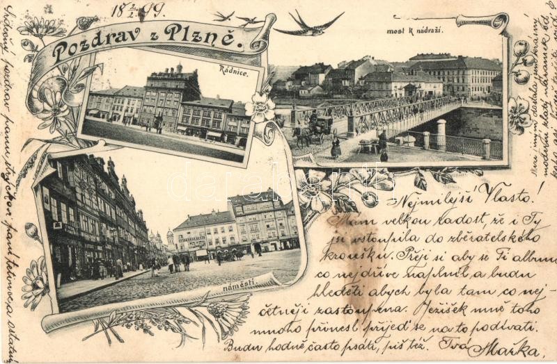 Beschreibung: 1899 Plzen, Pilsen; Radnice, most k nadrazi, namesti, Caffe Central / town hall, bridge, square, cafe. Art Nouveau, floral