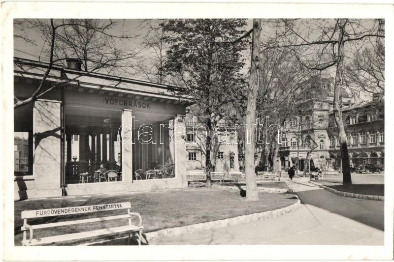 Beschreibung: Budapest II. Szent Lukács gyógyfürdő, fürdővendégeknek fenntartott pad, ivóforrások, gőzfürdő