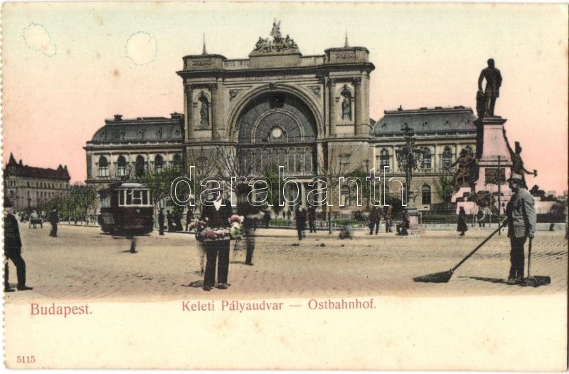 Beschreibung: Budapest VII. Keleti (Központi) pályaudvar, virágárus, villamos, utcasöprő