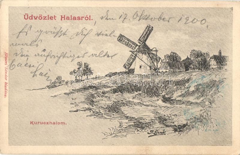 Beschreibung: Kiskunhalas, Halas; Kuruchalom, szélmalom. Kémeri Sándor kiadása, artist signed