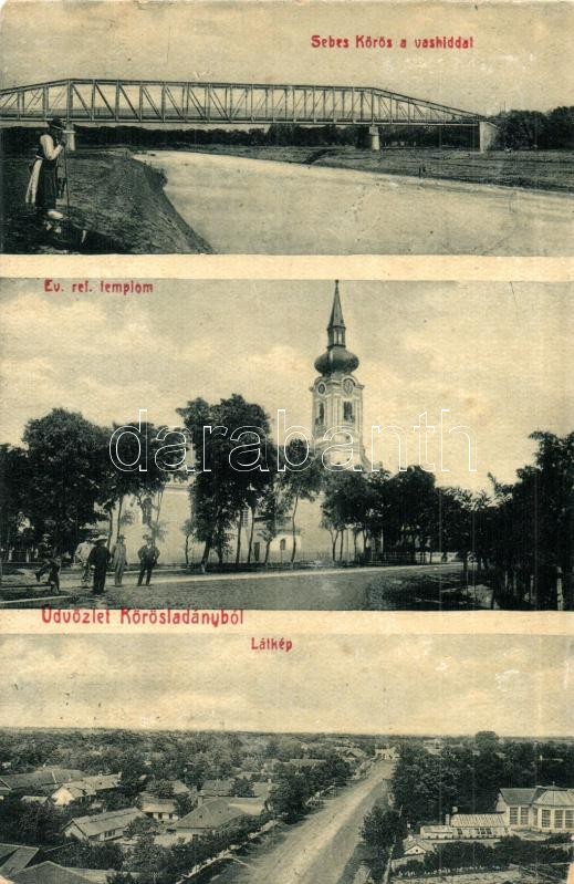 Beschreibung: Körösladány, Sebes-Körös folyó, Vashíd, Református templom, látkép. W. L. Bp. (EK)
