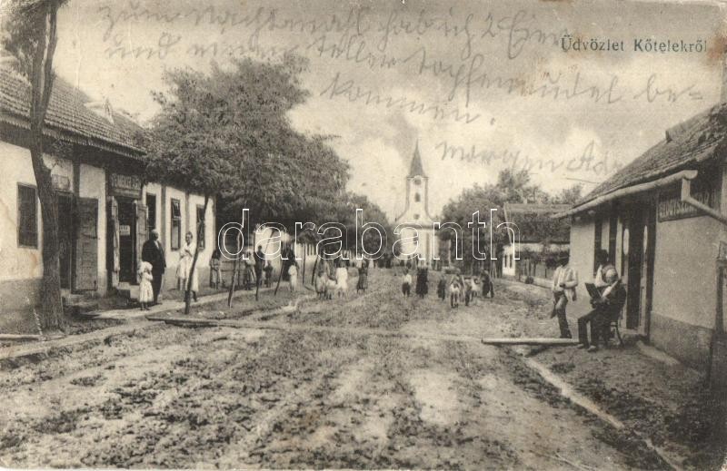 Beschreibung: Kőtelek, Fő utca, templom, gyógyszertár, Steinberger Miksa üzlete és saját kiadása (Rb)