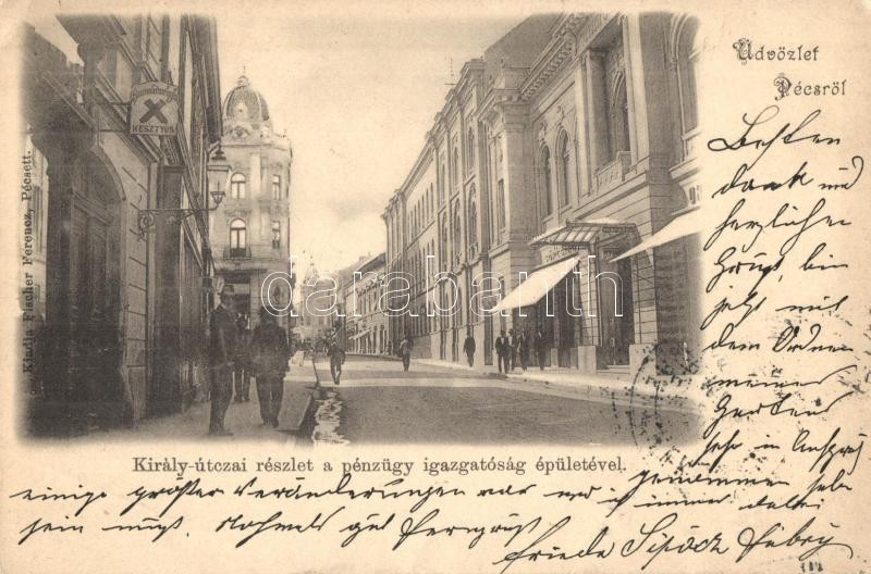 Beschreibung: Pécs, Király utca, Pénzügyi Igazgatóság épülete, Kenezenleitner Gyula kesztyűs üzlete. Fischer Ferenc kiadása (EK)