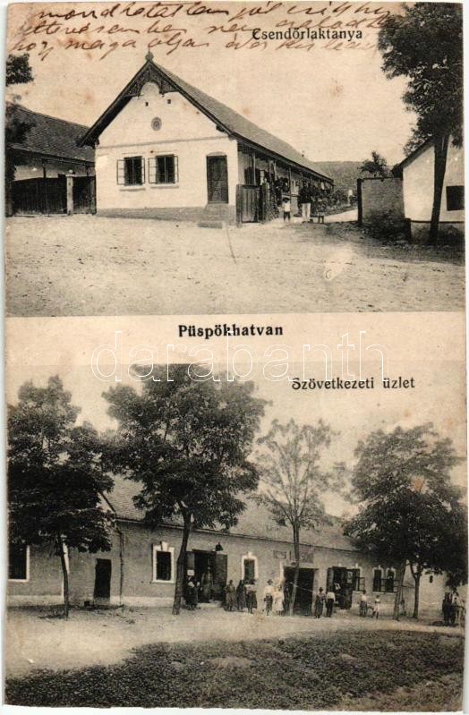 Beschreibung: Püspökhatvan, Csendőr laktanya, Szövetkezeti üzlet és saját kiadása (r)