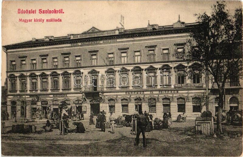 Beschreibung: Szolnok, Magyar király szálloda, étterem és kávéház, piac, megyei takarékpénztár, Fonciere pesti biztosító intézet, Engel és Herzfeld A. üzlete