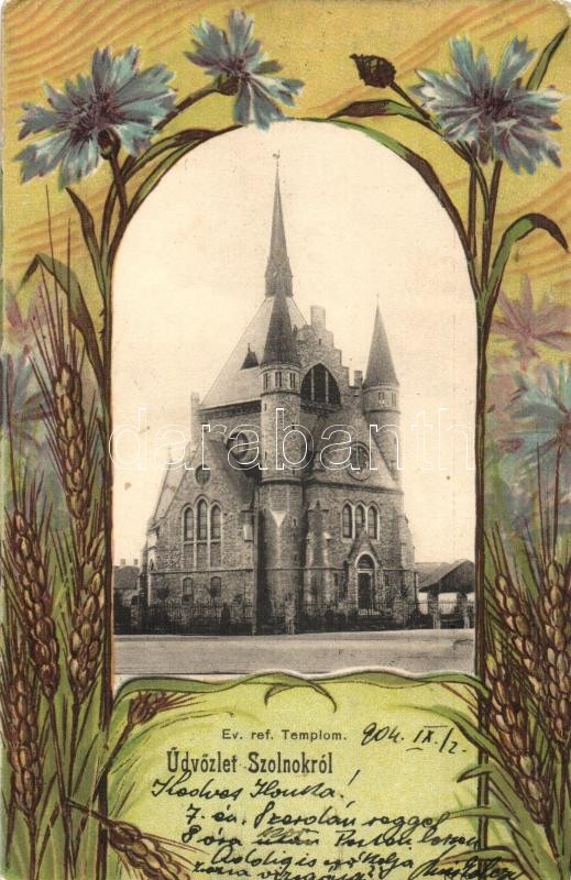 Szolnok, Református templom. Art Nouveau, floral, litho keret. Bakos I... https://www.darabanth.com/de/316-Fernauktion/316.0/Ansichtskarten/Ungarn~1500005/Szolnok-Reformatus-templom-Art-Nouveau-floral-litho-keret-Bakos-Istvan-kiadasa-kicsit-azot~II1737614