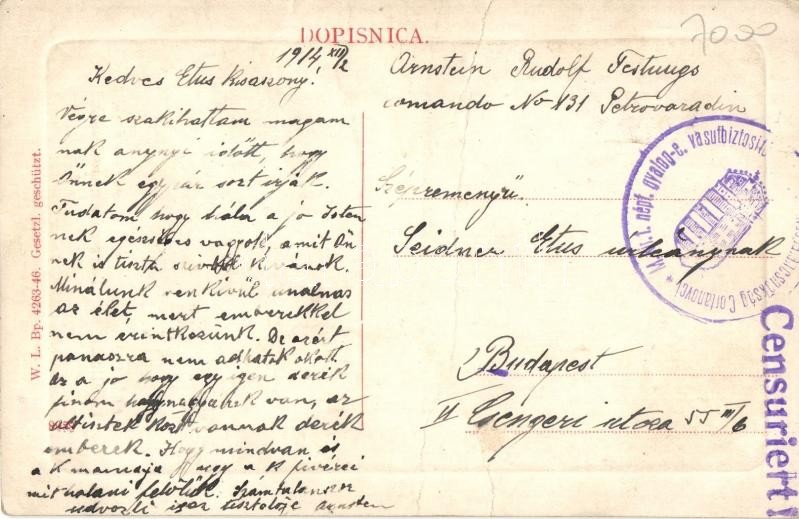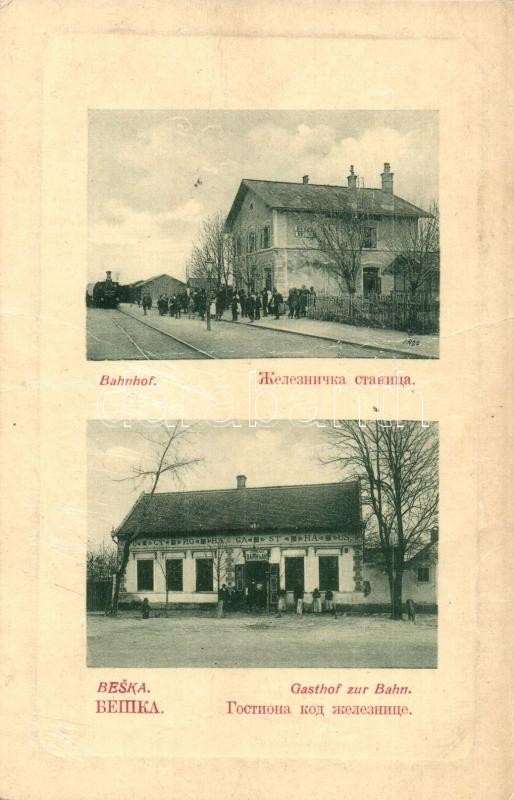 Béska, Beska; Bahnhof, Gasthof zur Bahn / Vasútállomás, gőzmozdony, vasúti vendéglő. W. L. Bp. 4263-46. / railway station, locomotive, railway restaurant, inn + M. kir. 1. népf. gyalog-ezred vasútbiztosító osztag parancsnokság Cortanovci (fa)