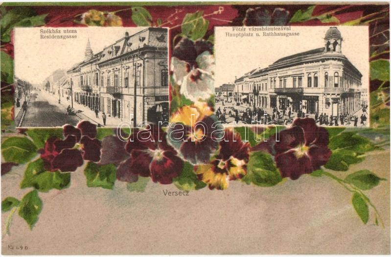 Versec, Vrsac; Székház és Városház utca, Fő tér, üzletek. Virágos litho keret ibolyákkal. Kehrer Lajos kiadása / street views with shops. Floral litho frame with violets