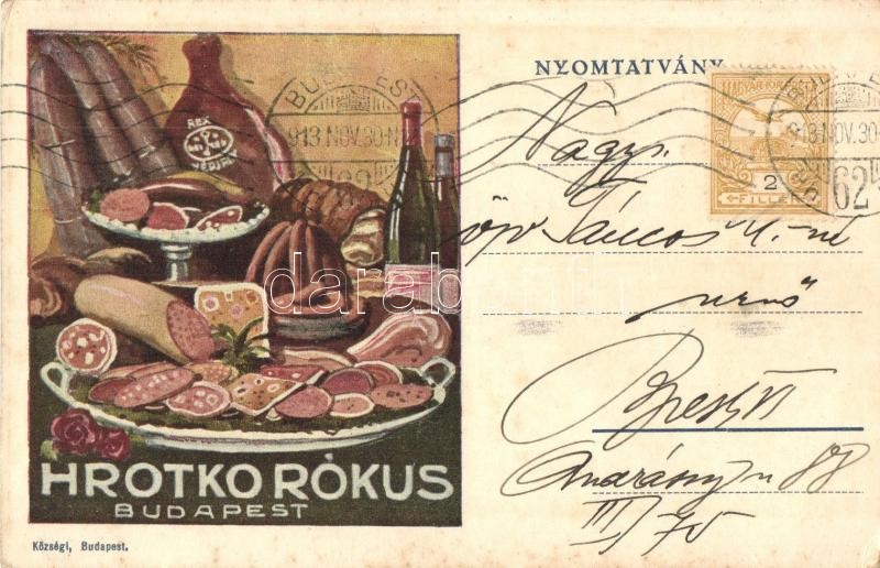 Hrotkó Rókus hentesárú- és csemegekereskedő prágai sonka főraktárának ... https://www.darabanth.com/de/316-Fernauktion/316.0/Ansichtskarten/Werbungen~1500071/Hrotko-Rokus-hentesaru-es-csemegekereskedo-pragai-sonka-foraktaranak-reklamlapja-Hunga~II1737362