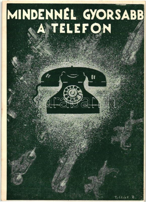 Mindennél gyorsabb a telefon. Új hívószám előjegyzése nyomtatvány a hátoldalon / Hungarian telephone advertisement. New telephone number registration on the backside s: Tellák R.