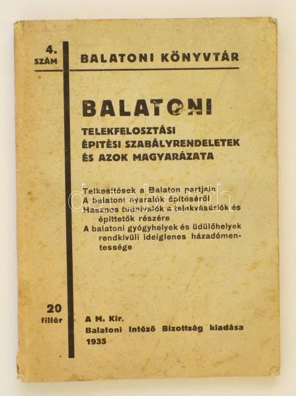 Telkesítések a Balaton partjain. A balatoni nyaralók építéséről. Hasznos tudnivalók a telekvásárlók és építtetők részére. A balatoni gyógyhelyek és üdülőhelyek rendkívüli ideiglenes házadómentessége. (Bp.) 1935. Balatoni Intéző Bizottság 85p..