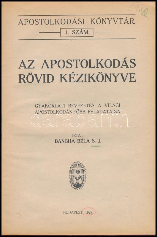Bangha Béla: Az apostolkodás rövid kézikönyv. Gyakorlati bevezetés a világi apostolkodás főbb feladataiba. Apostolkodási Könyvtár 1. szám. Bp.,1927, M. Kir. Belügyminisztérium Kísérleti Nyomdája, 64 p. Átkötött félvászon-kötés, kissé kopott borítóval, jó állapotban.
