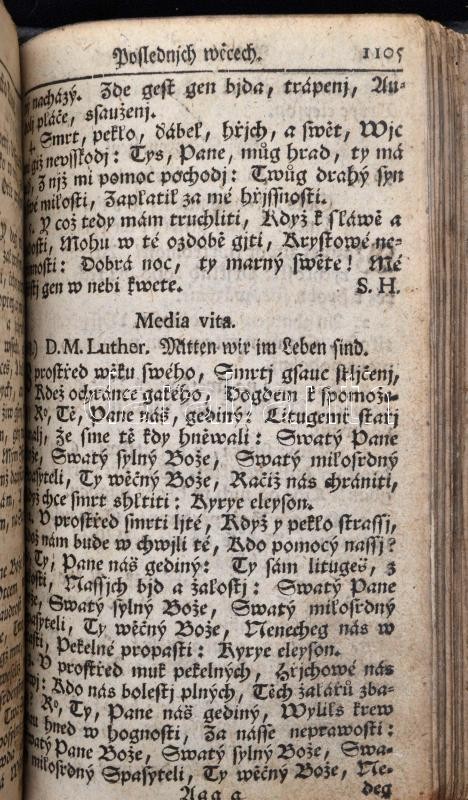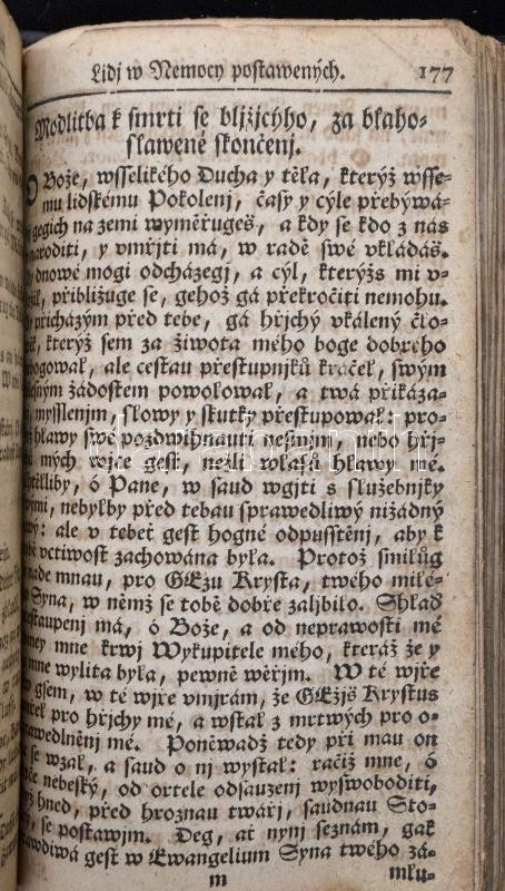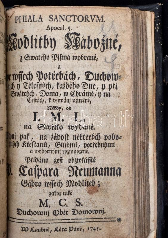 [Cithara Sanctorum PjsnÄ› Duchownj, Staré y nowé...]+ Phiala sanctorum : modlitby nábožné z Swatého Pjsma wybrné,.. Léta Páné, 1745, W LaubnÄ›, 39-1148+72+156+177-192 p. Szlovák nyelven. KésÅ‘bbi átkötött egészbÅ‘r-kötésben, kopott borÃtóval, a cÃmlap és a lapok a 39. oldalig hiányoznak, az elejérÅ‘l 5 lap kijár (39-48. oldalak), a második rész csak a 156. oldalig van meg csak, a második rész 177-192. oldalait az elsÅ‘ rész 1104-1105 oldalak közé és felcserélt lapokkal kötötték be (177-178+183-184+179-180+181-182+187-188+189-190+185-186+191+192), a lapok szélei néhol sérültek, kissé hiányosak, a lapok egy részén javÃtások, rossz állapotban, hiányos. Szlovák nyelvű evangélikus énekeskönyv,Tranoscius (TÅ™anovský, Jiřà (1597-1637):) 1745-ös kiadása./ Leather-binding, in poor condition, with worn cover, some pages lost, some pages mixed, some edge of the pages damaged, with repairs on some pages, in Slovak language.